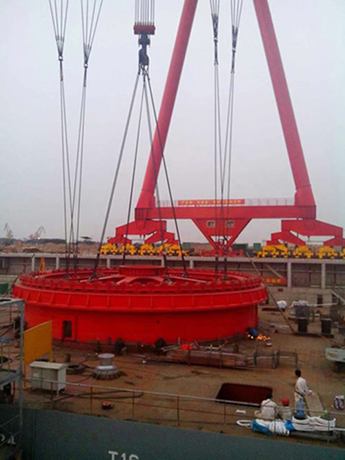 Nowadays, the crane’sfoundationbarrel has been installed and positioned smoothly. On June 10th, the darkness was fallingwhen the 1300 T floating crane arrived at the water area ofHaixinshipyard. Thestaffs of Haixin shipyard finished all the preparationwork and immediately put into the tense work under the nightupon the arrival of the crane.Thelifting work lasted for nearly onehour, after that the barrel weighting 300 tonnageswastransferred from the crane to shore and eventually safely landed in the assemblyplatform. On June 11th,under the stable lifting of 400 T gantry crane, the barrel was successfully lifted on the crane deck, with which the installation accuracy was controlled within the limits of design requirementsafter the positioning and correction.One employee who participated in this lifting work said: “this lifting work provides us a favorable opportunity for testing the loading performance of 400T gantry crane”. The crew commended that Haixin shipyard has stepped into a new phase of shipbuilding.