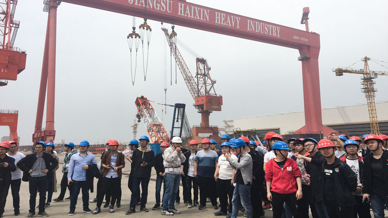 On April 24, 66 students of 2019 class leading by Mr. Huangbiao and Mr. Yin Qilin from ANAOE of JUST visited Jiangsu Haixin Shipping Heavy Industries Co., Ltd (“HAIXIN”) and the worksite at Tonghai Port. HAIXIN’s project manager, Mr. Yin Feifei showed students around whole shipyard in production streamline’s order with detailed explanation to enables students have a intuitive understanding of the General Arrangement of the shipyard. Project Manager of Tonghai Port, Mr. Fu Xiaojian, made a vivid and thorough introduction of high piled wharf at spot, which also received positive feedback on site from students and approved to be a successful Pre-Service Practice.