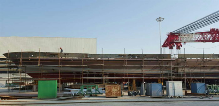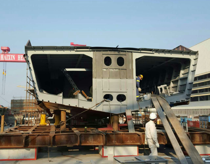 目前,先開(kāi)工的HX023船的鋁質(zhì)上建已經(jīng)制作完畢,等待吊裝,后開(kāi)工的HX022船的機(jī)電設(shè)備已逐步到廠。兩艘公務(wù)船的美麗線型,已在總裝平臺(tái)上展現(xiàn)雛形。